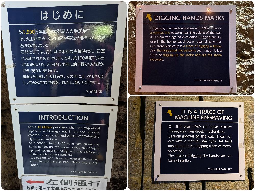 每個區域的石壁上都有日英文解說,在 1959 年之前,都是用手鑿的,1960 年開始才用機器採石。