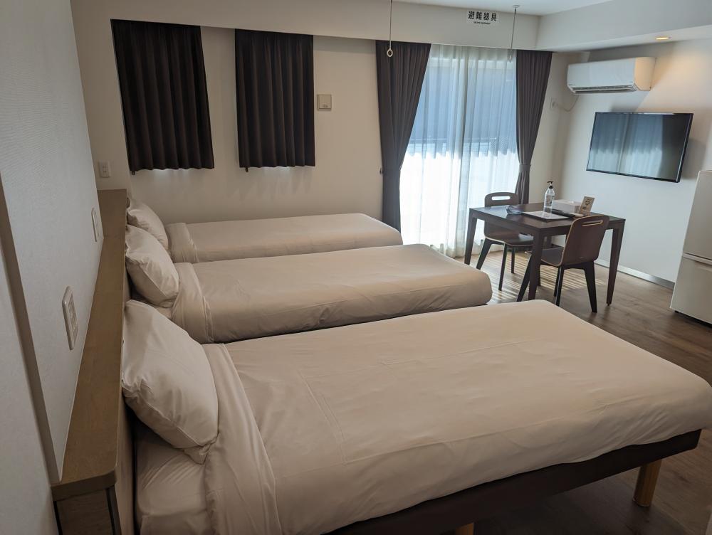 房間很大,基本上一定會比多數飯店大,三張床,不過床有點窄,不能翻身的窄,有餐桌、電視、冷氣會冷,窗簾也算遮光,除了床窄都還可以。