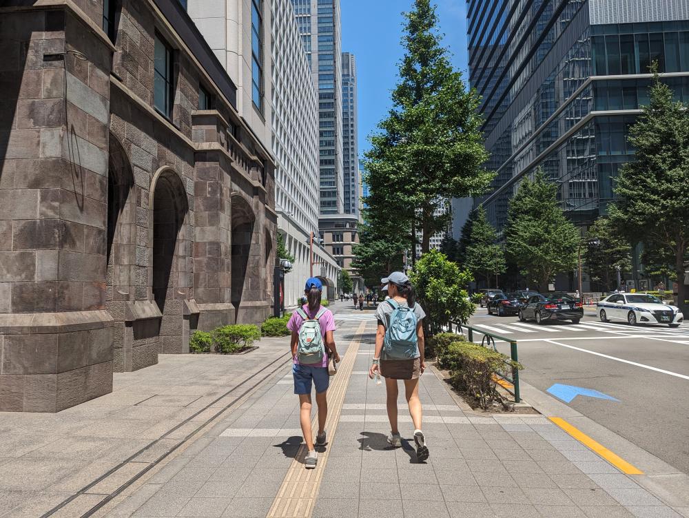 離開腹地極大的皇居,我們往東京車站的方向走。來到一棟辦公樓,有 Tully's 和 7,各自買了喜歡的飲料繼續上路。今天就看雙腳能走多遠。