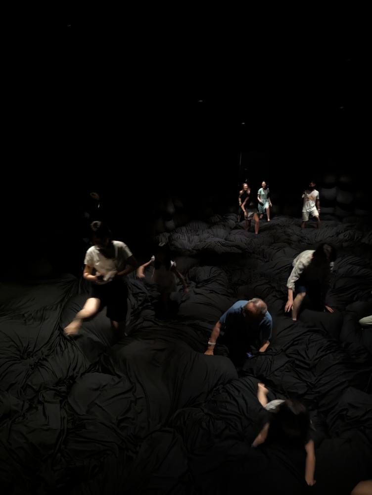 準時入場後,先換鞋,只能光腳入場,有兩條路,先直走右轉,摸黑走一小段上坡,像走在水溝裡,淹到小腿。然後進入一個漆黑的房間,有很多類似無印良品的懶骨頭,踩著"大沙包"往前爬,腳在這邊也差不多乾了。如果沒乾,中間有個擦腳區,免費毛巾擦完即回收。