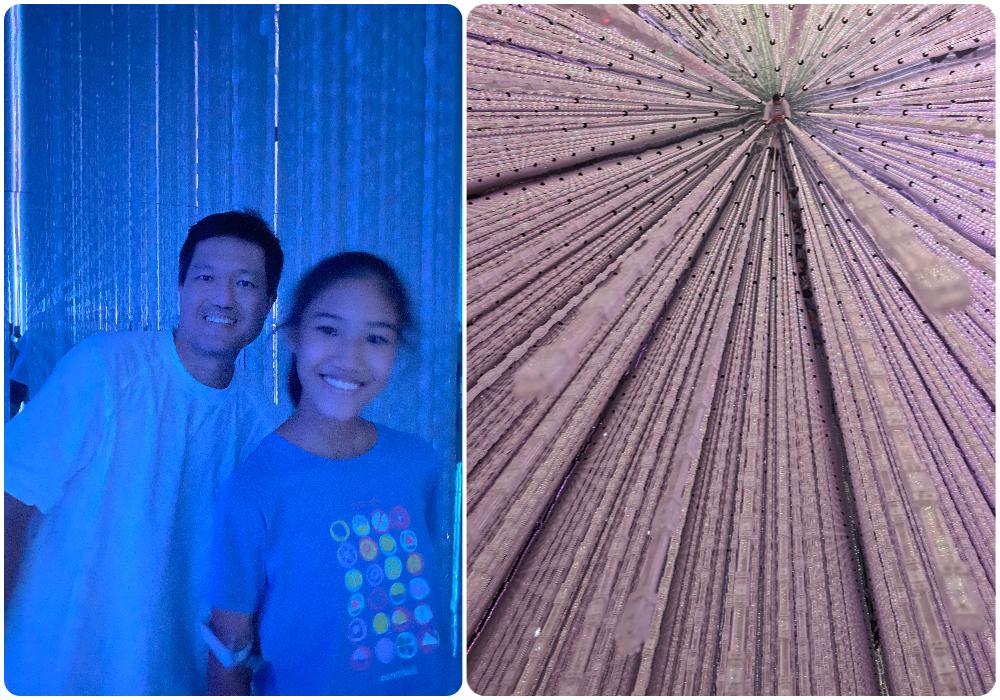 然後來到一個充滿直條 LED 燈的房間,有好幾條路相通,LED 燈是從天花板通到地面,加上地板是透明的,反映出千千萬萬的燈條,金光閃閃、瑞氣千條(?)