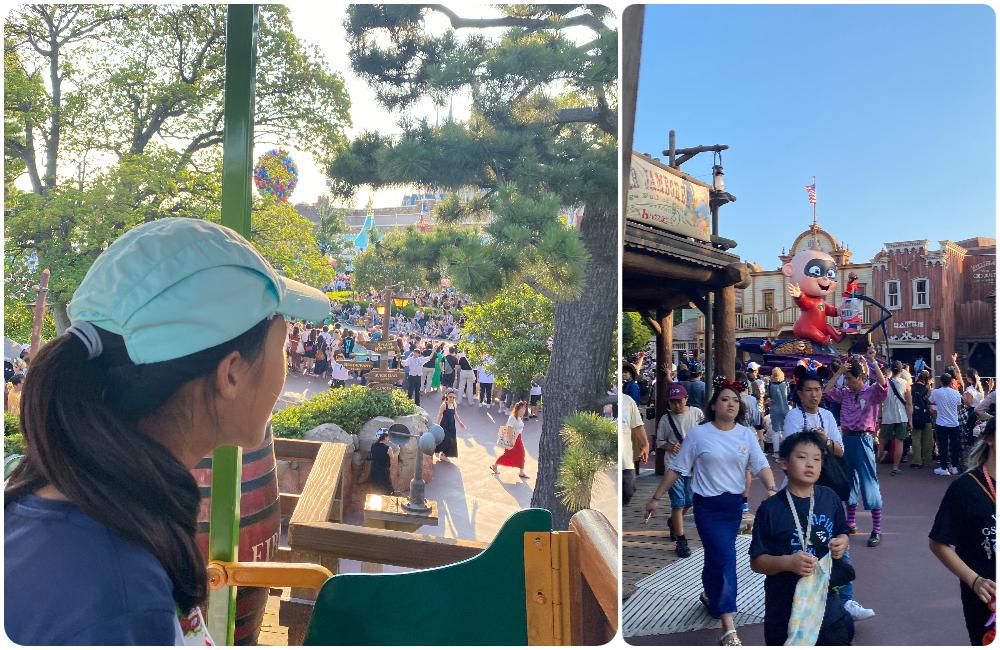 她們在西部世界也玩了經典的礦車雲霄飛車,然後坐空中小火車,剛好凌空欣賞下午的遊行。
