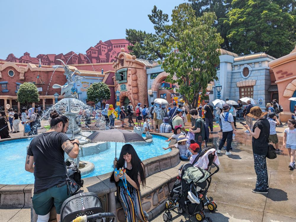 結果沒賣傘,只買了一條涼巾,沾水弄濕後從此一直披在我的脖子上,陪我度過剩餘的旅行。說真的,這條涼巾救了我的命。另外,請大家一定要來看秀,特別是「米奇魔法音樂世界」,超級無敵必看,我們在看了不到十分鐘後,就覺得門票回本了,說的不誇張,光是看這場秀,東京迪士尼就值回票價。而且,就在我快中暑崩潰前,有個舒服的椅子坐,加上冷氣,緩減了我的頭脹頭熱,讓我可以繼續玩下去。