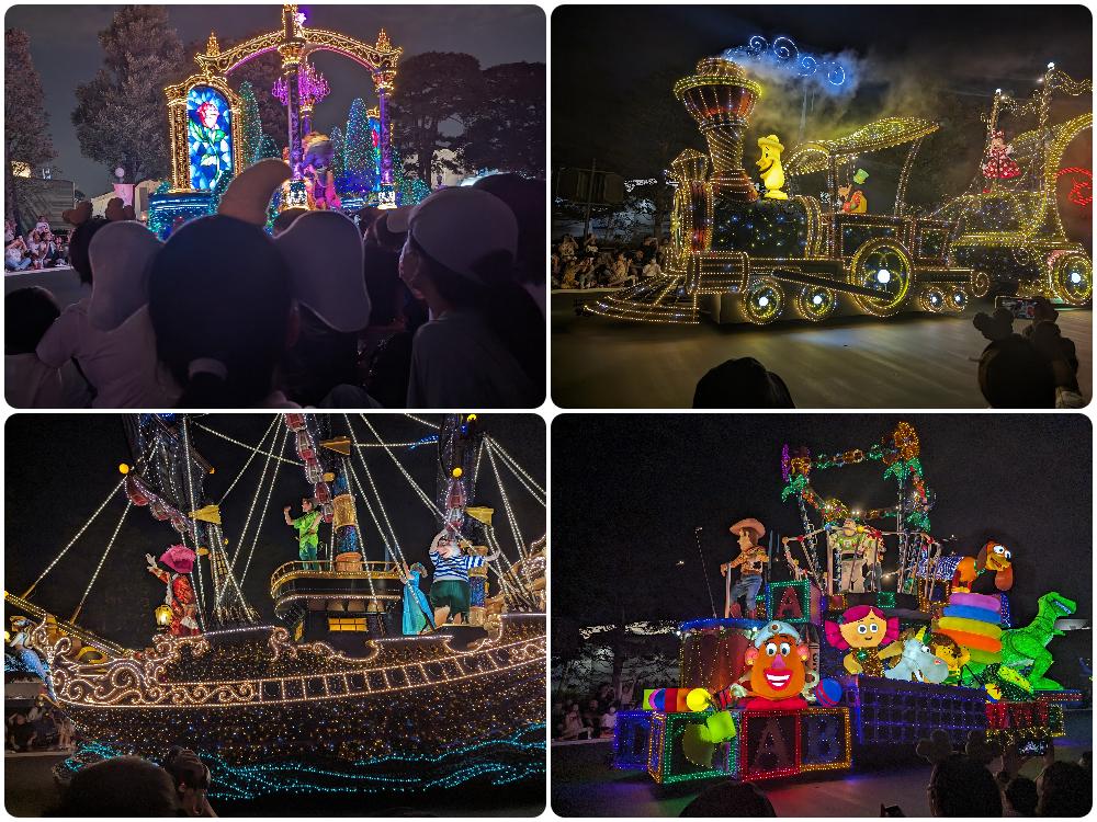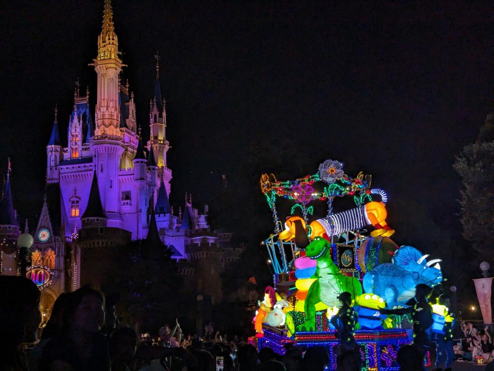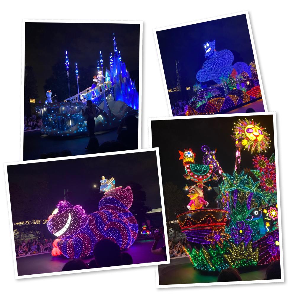一台台花車經過,車上各種角色和你打招呼,我也和他們打招呼,很難想像白天這些人偶有多熱,這份工作不輕鬆啊。