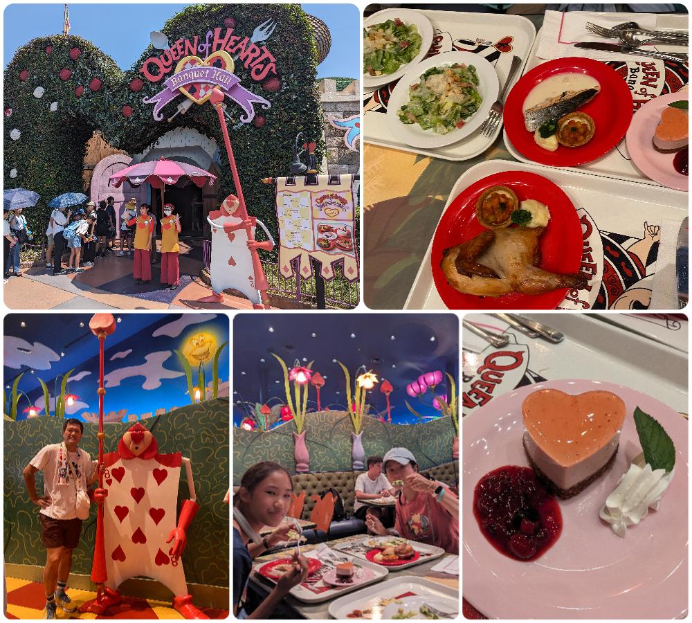 迪士尼園區內有很多餐廳,我們選了這間紅心皇后餐廳,時間剛好中午,所以又要排隊,外面十分鐘,裡面十分鐘,拿托盤,跟內場說你要什麼,結帳後才能去找位置坐下。