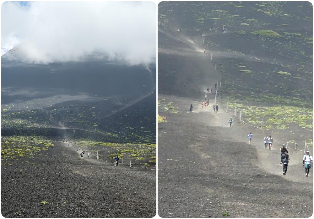 御殿場路線是完全的火山岩地質,黑沙漫天,也會進到鞋子裡。如果要攻頂的話,就直直上 10.5 公里,聽起來還好嘛 XD