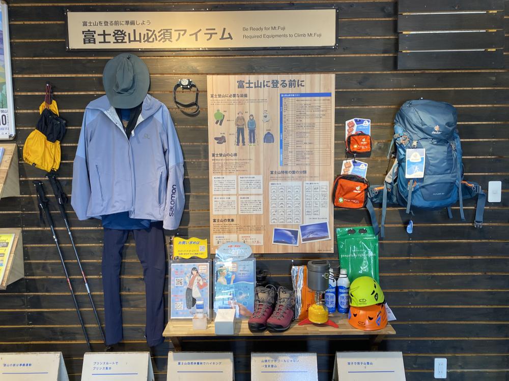 御殿場新五合目管理小屋裡面,有一些歷史背景介紹,和登山須知,牆面上是標準的登山裝備,及建議服飾。