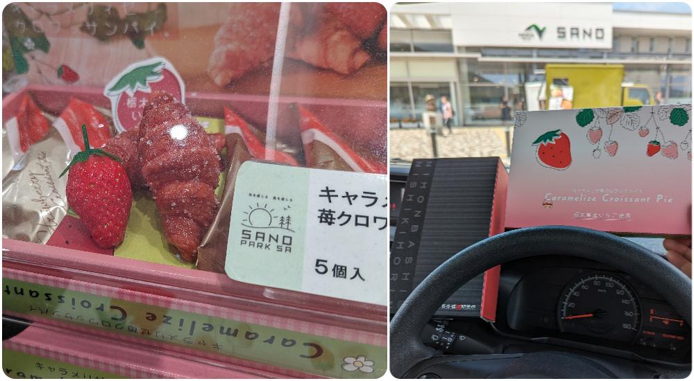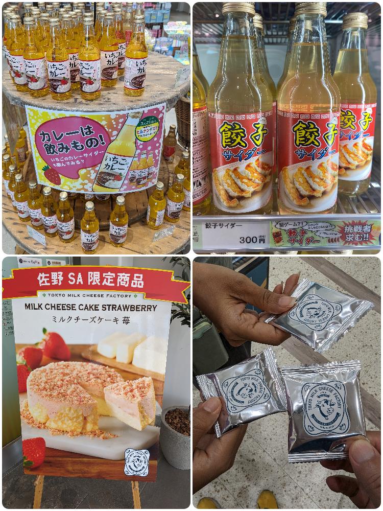 佐野 SA 也有販賣地方土產,左上是咖哩口味汽水,右上是餃子口味汽水,你敢喝哪一種?我是都不敢。我只敢吃左下的限定起司蛋糕,但後來只免費試吃了右下的餅乾。