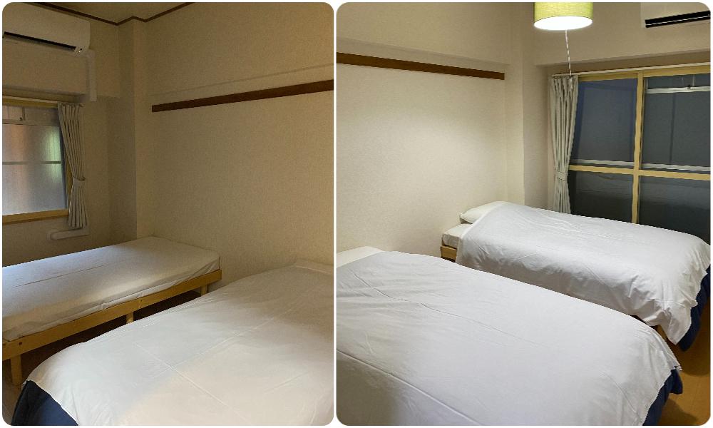 這個單位有四張床鋪,一個房間兩張,我們訂三人,所以只鋪好三張床。床的寬度可以,也很好睡。