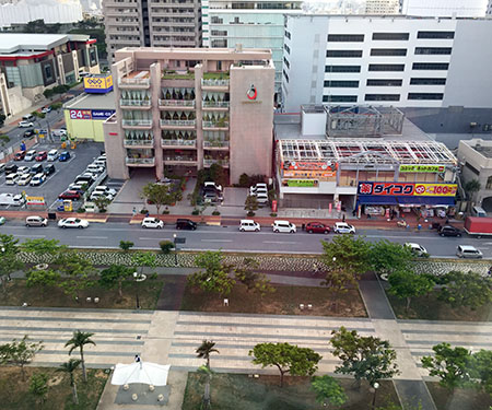 沖繩的頭兩晚住宿,我們選在新都心站的自由花園飯店,下圖是從我們房間照出去的,適合來解釋一些周遭區域。首先,出了新都心站後左轉,沿著空橋直走(藍線),約三分鐘後下樓梯,或坐電梯,也有單向電扶梯,往上的。經過"神秘"圓環或直接過馬路到對面,看到最高的那棟就是,地點非常好,而且離電車站不遠。電車站旁邊就是DFS免稅商店街,也是OTS租車取車處,在對面有一家24小時的影音書籍店,晚上睡不著覺可來這混,以地點來說,我先給自由花園一個讚...[暢遊沖繩] 新都心住宿推薦 自由花園飯店