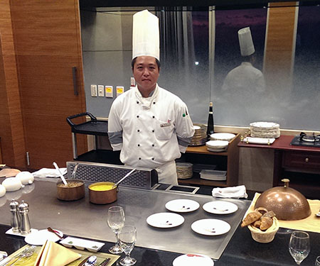 太陽下山後,我們來到H會館的「海之悅鐵板燒」享用晚餐,今天吃的是$1680的套餐,據說這方圓百里之內,或整個恆春半島是沒有其他家鐵板燒的,所以這間常常客滿,以後來一定要先訂位喔。我們今晚的大廚-趙師父,來賓請掌聲鼓勵鼓勵 術業有專攻,如果可以,我基本上都不太想點餐,完全交給專業人士為我設想,並滿足我的味蕾,今晚,就看專業的趙師父表演了