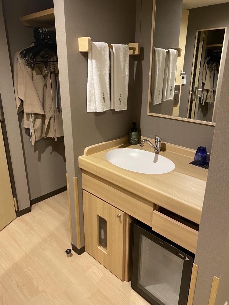 小洗手台,附兩套浴衣,另一套去樓下拿,右下方有小冰箱。