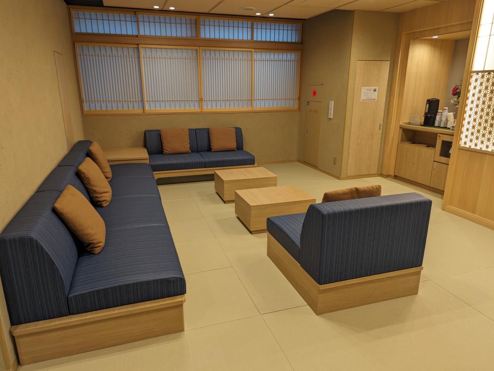 Lobby 一旁的沙發區,還有免費茶飲,看這沙發和靠枕配色,日本就是如此美感和質感兼具啊,怎能不常來呢?