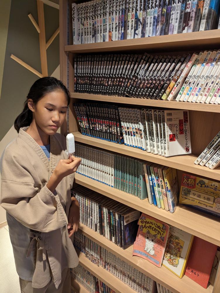 還有最新、最大人氣的漫畫,舊的漫畫都會被新的取代,因為我們四月才住過,所以有發現漫畫換了。我女兒看好久才進去找媽媽。