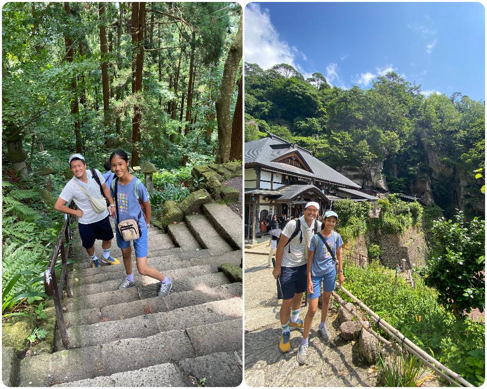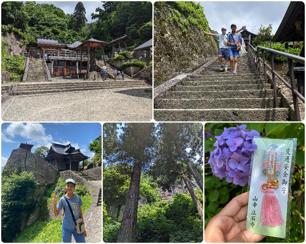 腳勤的一家人很快就爬到上面,對於昨天已被單車訓練過的雙腳,山寺比想像中來的簡單。往下看風景優美,半山腰有間紀念品店,我們買了一個行李箱貼紙,很貴。