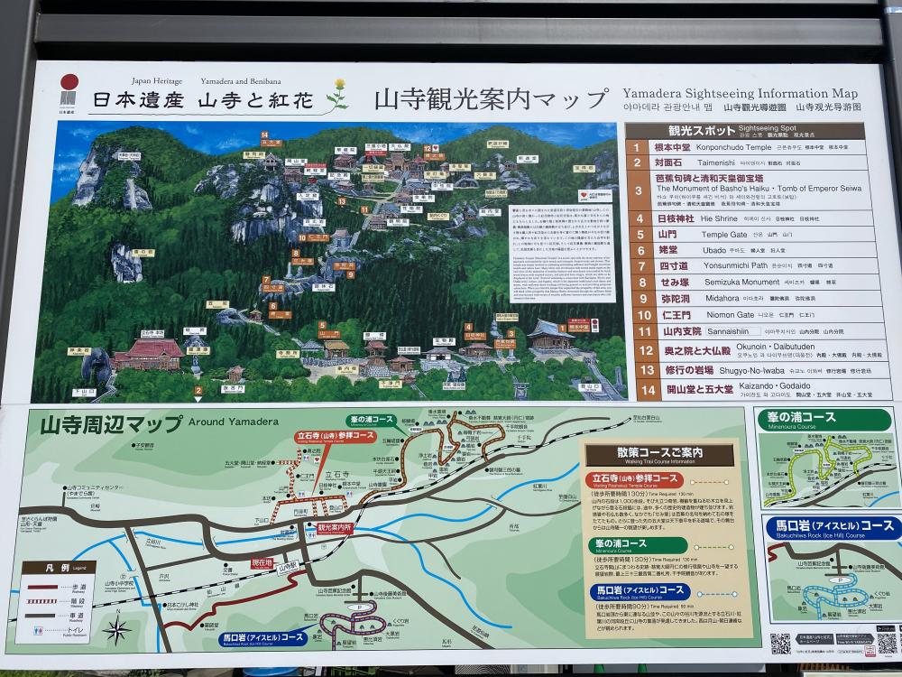 山寺是山形縣知名景點之一,四季有不同景色,聽說冬天積雪時非常難爬,還好我們現在是夏天。照一下地圖就上路吧~